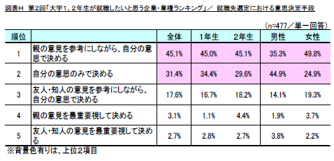 最後に、就職先を選定する際の意思決定手段について尋ねたところ、「親の意見を参考にしながら、自分の意志で決める」(同45.1%)が1位となり、次いで「自分の意志のみで決める」(同31.4%)が2位、「友人・知人の意見を参考にしながら、自分の意志で決める」(同17.6%)が3位となりました。(図表H)