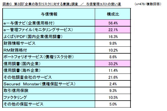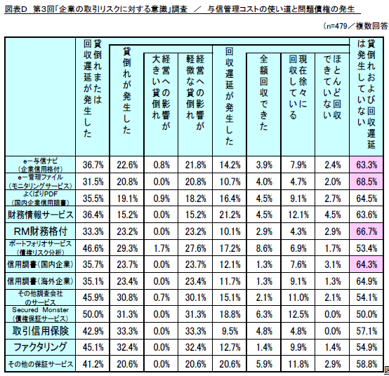 また、問題債権の発生状況と照らし合わせてみたところ、「信用状態モニタリングサービス」(同68.5%)、「RM財務格付」(同66.7%)が、貸倒れや回収遅延の発生防止に寄与している結果となりました。その他、与信コストの使い道として利用度の高い「企業信用格付」や「信用調書(国内企業)」においても同様に、貸倒れや回収遅延の発生防止に対して効果が見られる結果となりました。「企業の信用度を小まめにチェックできる情報ツール」が実績に裏付けられて、信頼を得ていることがうかがえます。(図表D)