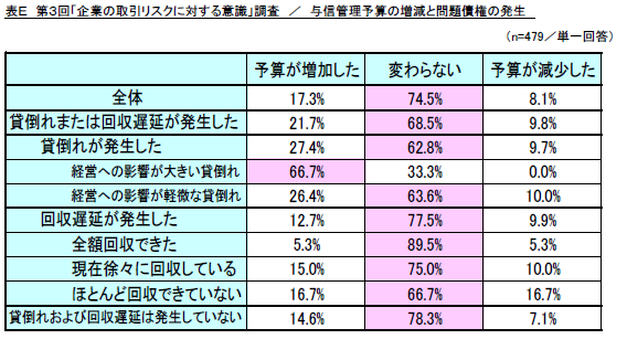 また、予算の変動に対して、近年の貸倒れ・回収遅延の発生状況を合わせて調査したところ、「経営への影響が大きな貸倒れが発生した」企業においては、当然ながら「予算が増加した」(同66.7%)と回答した企業が圧倒的に多く、回収できた