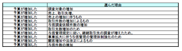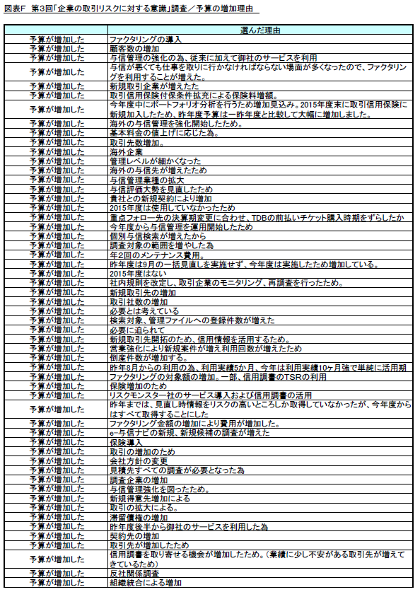 RM会員における昨年度と今年度の与信管理に対する予算の増減理由を調査したところ、「予算が増加した理由」としては、「取引先が増加したため」という回答が最も多く、その他には「ファクタリングなどを活用した保全の強化を図るため」、「与信管理を新たに取り組むこととなったため」という回答が見られました。(図表F)