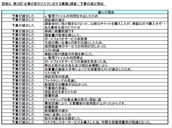 一方で、「予算が減少した理由」としては、「コスト削減のため」という回答が最も多く、その他に「保証料金が低減したため」という回答がみられました。(図表G)