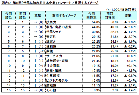「世界に誇れる日本企業」として重視するイメージを聞いたところ、「技術力」を挙げる回答が54.6%と最も多く、次いで「製品・商品の品質」(回答率44.3%)、「世界シェア」(同30.9%)、「安定性」(同29.1%)となりました。上位4項目は前回と同順位となっており、企業を世界に誇れると感じる主な要因に大きな変化は見られないことが分かりました。(図表D)