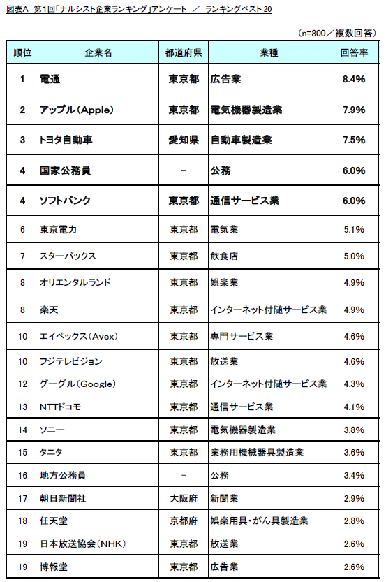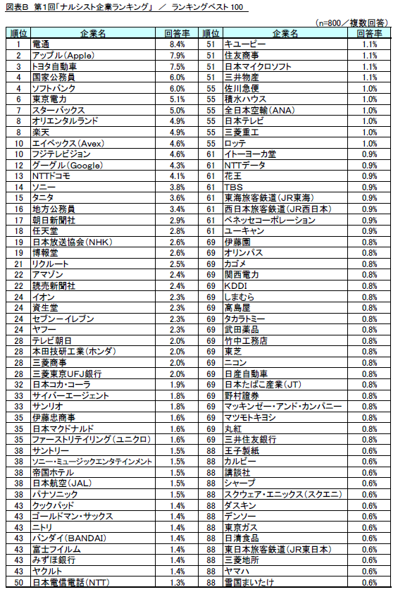 調査結果発表:リスモン調べ~第1回「ナルシスト企業ランキング」調査~「電通」「アップル」「トヨタ自動車」がTOP3という結果に!