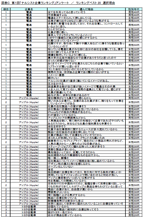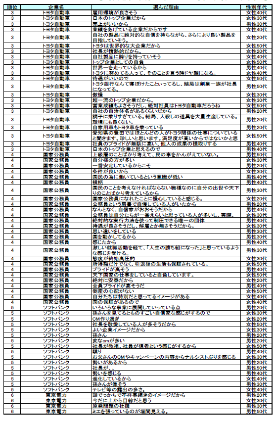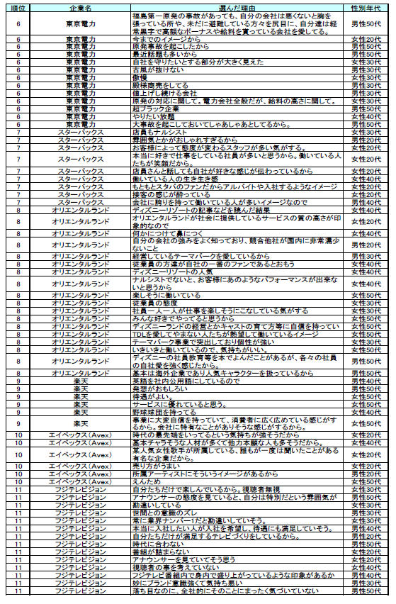 ②のナルシスト企業の選択理由の分析から、ナルシスト企業に対するイメージは、事業内容や業界内のポジション、雇用条件などから生じる「偉そう」、「傲慢」、「勘違いしている」といったマイナスイメージと、商品の品質や先進性、社風や待遇などから生じる「会社愛が強い」、「商品愛が強い」といったプラスイメージとに分かれる結果となりました。ランキング上位企業では、前者としては、「電通」や「国家公務員」、「東京電力」などが挙げられ、後者としては、「アップル(Apple)」、「トヨタ自動車」、「スターバックス」、「オリエンタルランド」などが挙げられます。