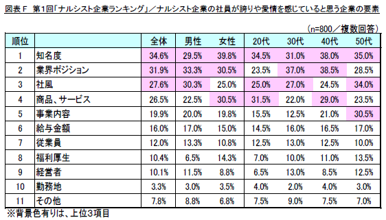 ナルシスト企業の社員が、企業のどの要素に誇りや愛情を感じていると思うかというアンケートを行ったところ、1位が「知名度」(回答率34.6%)となり、2位が「業界ポジション」(同31.9%)、3位が「社風」(同27.6%)となりました。上位3項目においては、男女別、世代別においても概ね同様に高い順位となっており、企業の知名度や、業界内の地位が高いことが、ナルシスト企業だと思われる大きな要素になっていることを窺うことができました。(図表F)