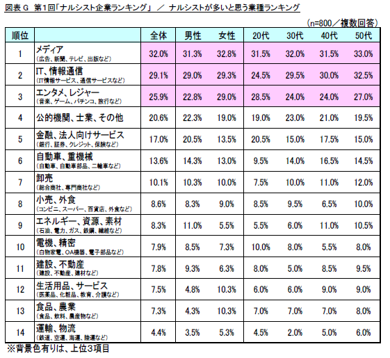ナルシスト企業が多いと思う業種について、1位が「メディア」(回答率32.0%)となり、次いで2位が「IT、情報通信」、3位が「エンタメ・レジャー」(同25.9%)となり、上位3業種においては、男女別、世代別のすべての区分においてTOP3入りとなりました。(図表G)