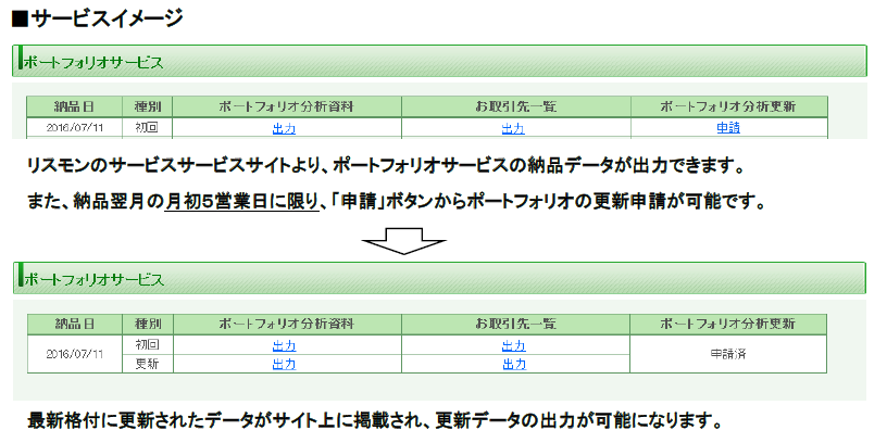 与信管理ASPクラウドサービスを提供するリスクモンスター株式会社( 以下リスモン、本社: 東京都中央区、http://www.riskmonster.co.jp/)は、2016年7月17日(日)より、リスモンのサービスサイトにてポートフォリオサービスの納品データを出力したり、データ更新後の最新の格付で納品データを更新したりすることができる「ポートフォリオサービスWeb管理機能」(以下 本サービス)の提供を開始いたします。