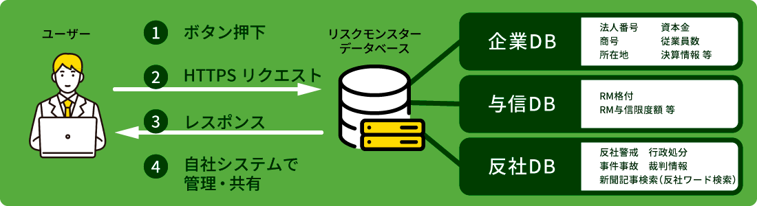 リスクモンスター独自の約550万社超の企業データベースをはじめ、 与信判断に役立つ指標や反社・コンプラリスク指標を自動で自社システムに連携することが可能です。