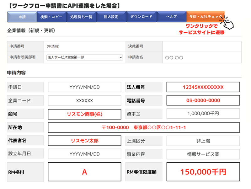 リスモンスターが提供する独自企業データベースとSmartViscaとの連携により、SalesforceにRM格付や企業情報、反社リスク情報を反映し、社内の取引先申請業務を効率的に管理・共有することが可能となります。