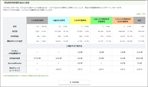 e-管理ファイルに蓄積された情報から、取引先全体のリスク構成や比率・リスク金額など、自社のリスク状況がボタン1つで把握できます。CSVデータやPDFレポートでの抽出も可能なので、社内の報告資料や定期説明資料にも活用いただけます。またリスク管理の提案まで自動で行うため、最適な与信管理の運用が実現できます。