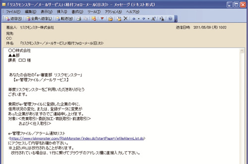 「e-管理ファイル」ではリスクモンスターが貴社に代わり、貴社取引先の信用状況変化や企業データの変更をキャッチし、情報に変化があった際に電子メールでお知らせいたします。「アラーム通知リスト」を見れば「いつ」「どの企業の」「何が」変わったかをすぐに確認することができます。
