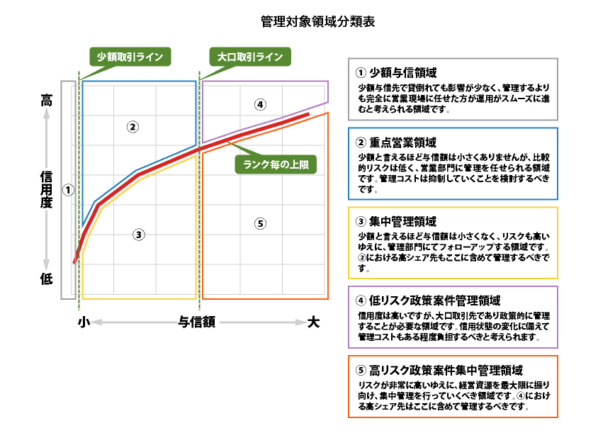 本当に管理をしなければならない取引先は「信用力が低く、かつ債権残の多い先」です。格付と与信額の2軸で捉え、リスクの濃淡によって管理体制を変える必要があります。