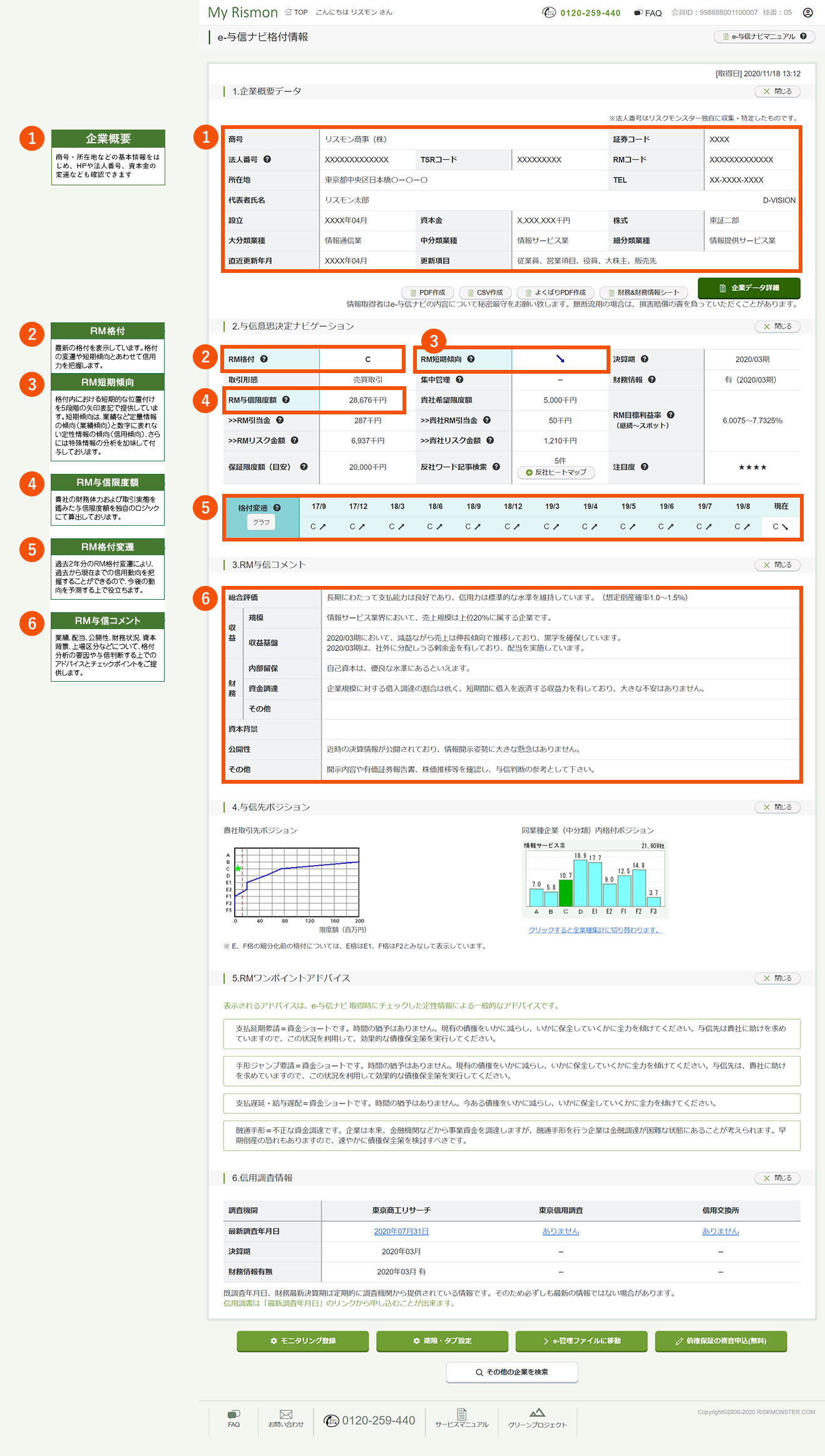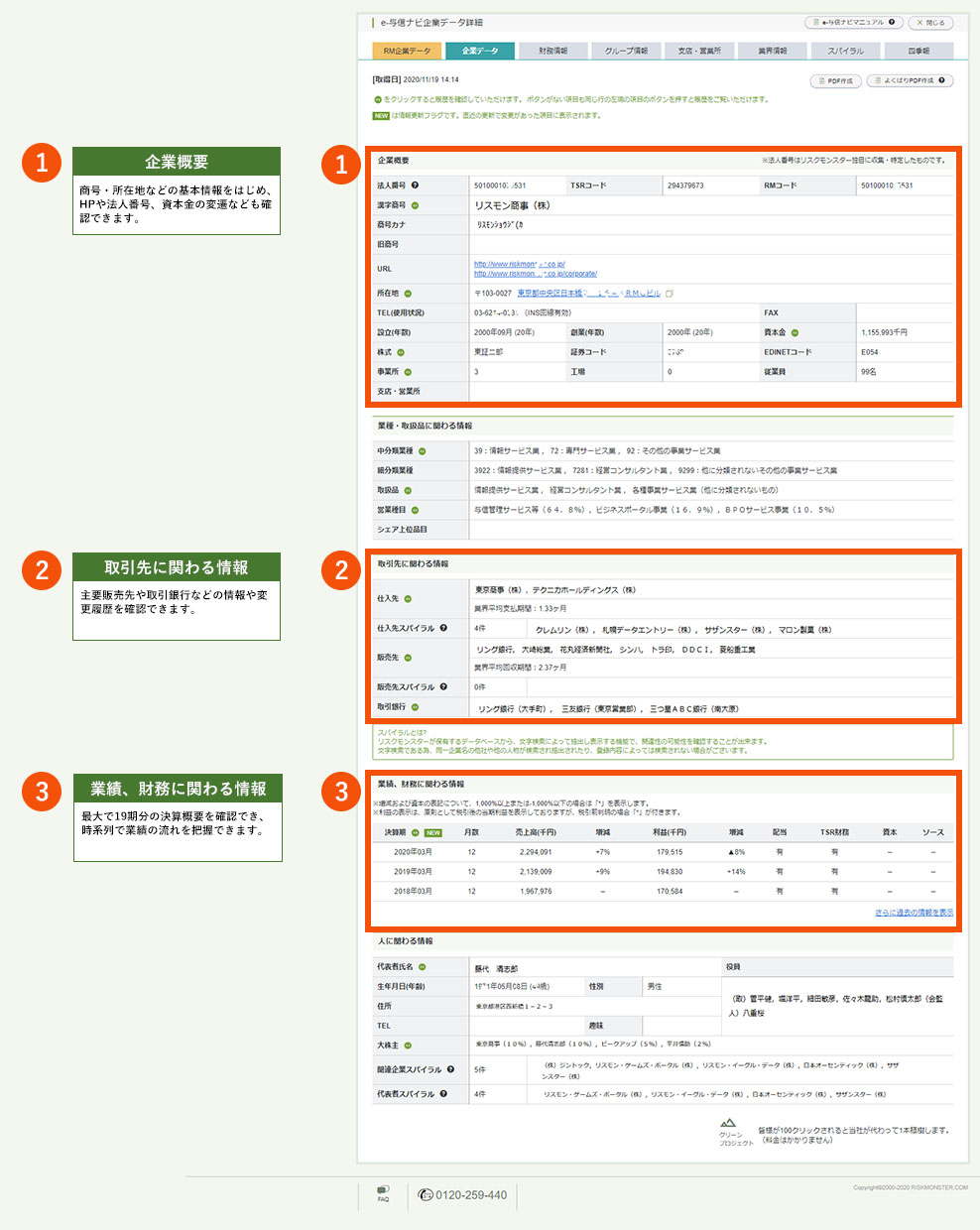 リスクモンスターが保有する約540万社の独自企業データベースをもとに、与信対象企業が倒産に近いか遠いかの格付をご提供します。また、同時にいくらまで与信可能か示す与信限度額や、目標利益率などの与信管理上必要な情報を合わせてご提供し、貴社の与信意思決定を的確にナビゲートします。もちろん、随時更新される企業データベースですので、お取引先の基本情報の収集にもご利用いただけます。